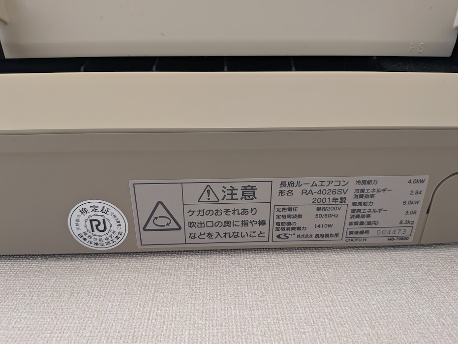 エアコンのメーカー長府の2001年製です。