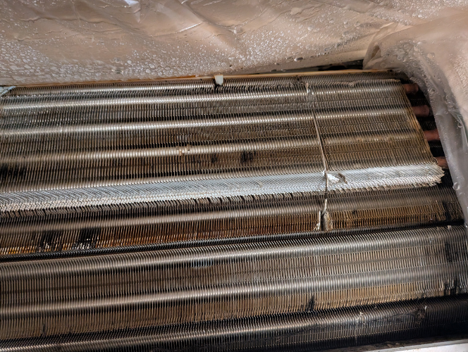 趣味の部屋に設置されているエアコンです。タバコを吸われているとの事で、熱交換器がベタベタしていました。タバコに含まれるタールは油性で粘性がある為だと考えられます。このエアコンはホコリはあまりついていませんが、使用される環境によっては粘性があるのでホコリが付きやすくなります。